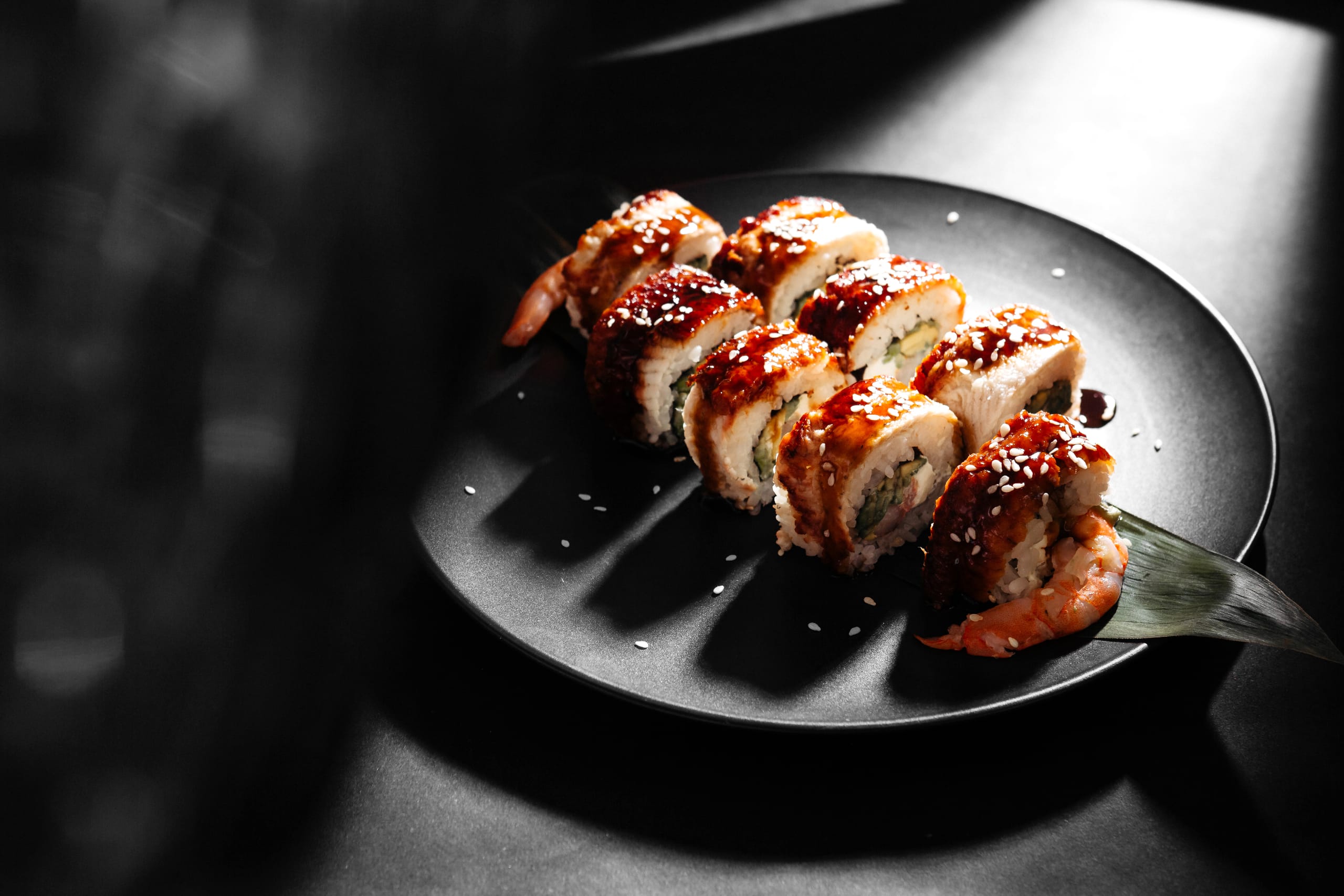 Indulge in our Dragon Roll, featuring tempura shrimp and cucumber inside, topped with sliced avocado, eel sauce, and sesame seeds, creating a visually stunning and delicious roll.